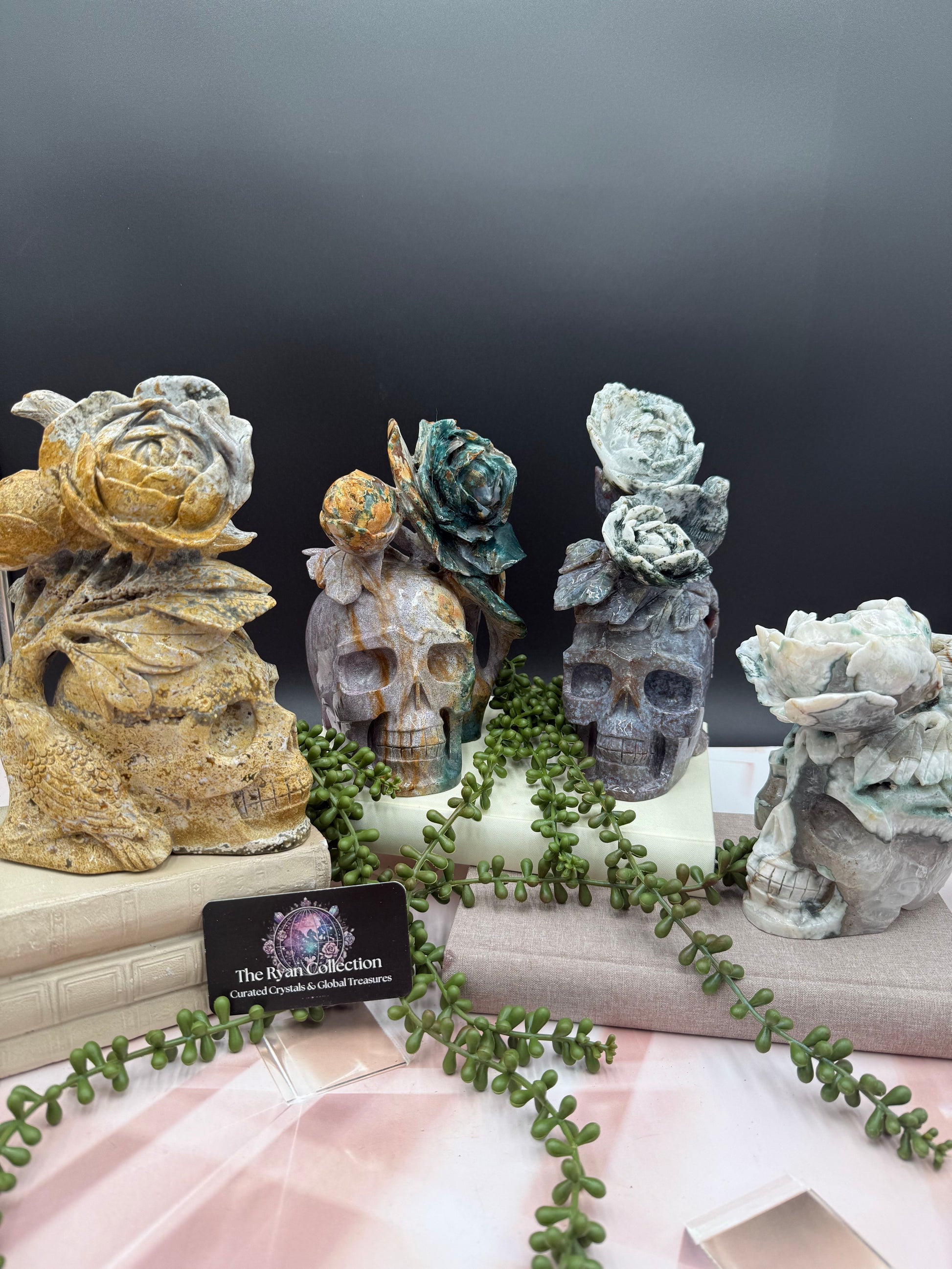 This magnificent Gold Ocean Jasper skull sculpture, intricately adorned with a hand-carved floral motif, is a true masterpiece of nature and craftsmanship. Weighing 2.78 kg (6.13 lbs), this striking piece embodies the energies of renewal, grounding, and inner harmony, making it a perfect addition for collectors and spiritual seekers alike.