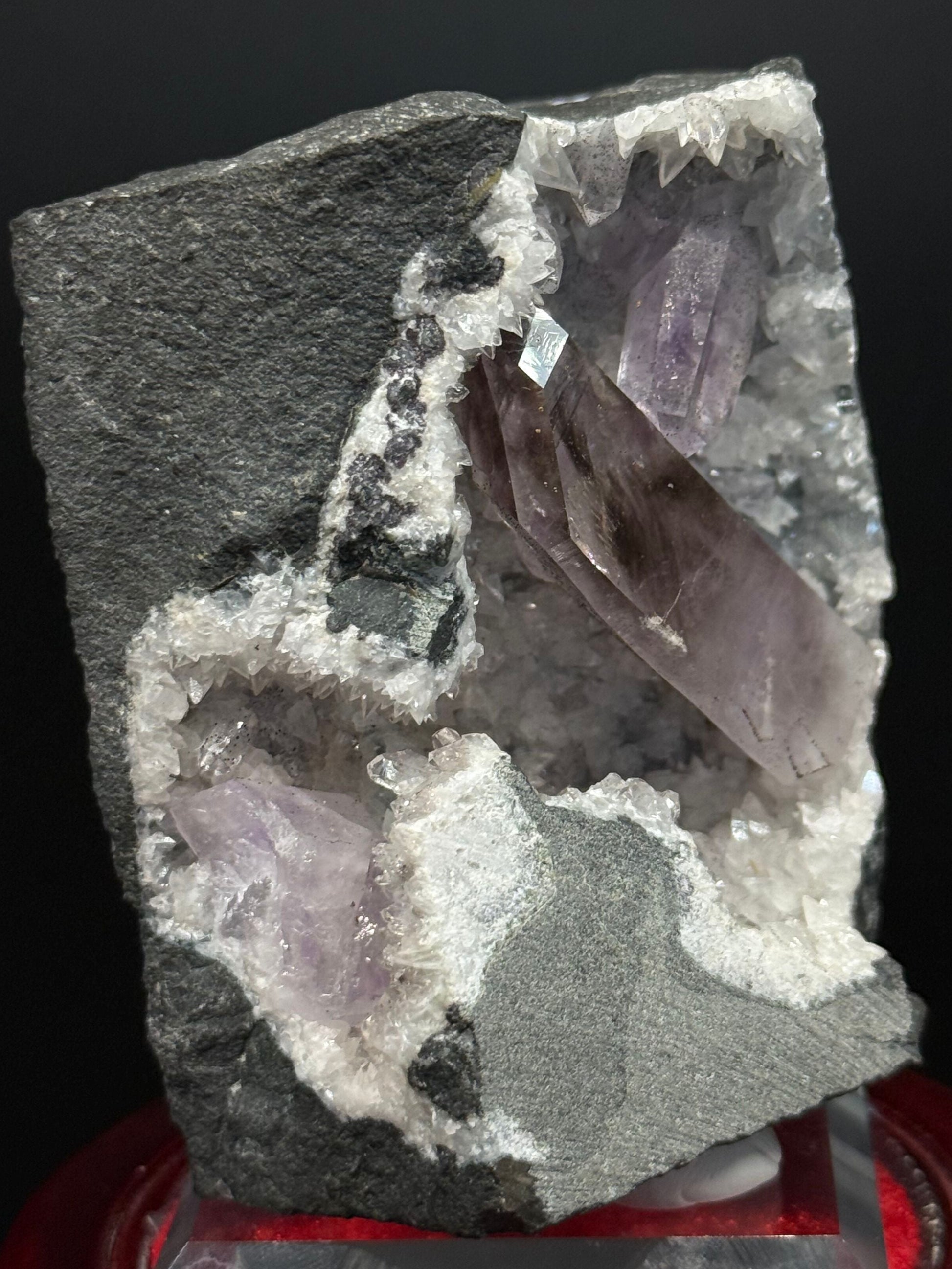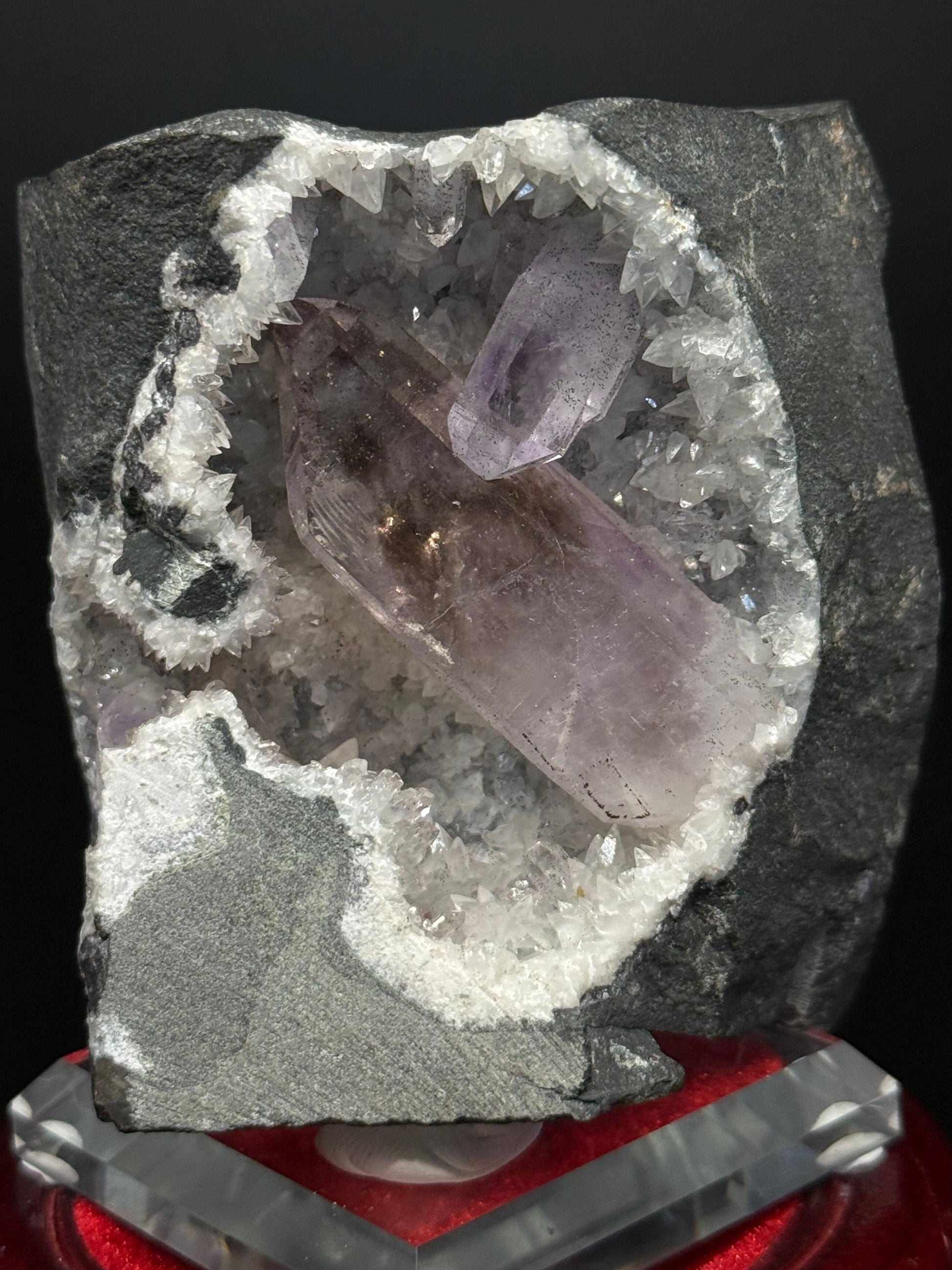 This exquisite Brandbert Quartz specimen features deep amethyst-toned quartz crystals emerging from a beautifully preserved geode-like cavity. The contrast between the rich violet terminations and the raw dark matrix adds to its striking visual appeal. This rare specimen is an exceptional addition for collectors and energy practitioners alike.